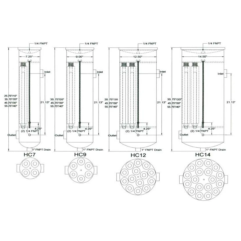 Our housings are available in multiple height options to accommodate filter cartridges from 10″ to 40″ in length. Configurable connections choices are NPT female ports which can protect threads during shipping or 150# ANSI flanges. These standard sizes can handle from 2 to 500 GPM. Multi-round filter cartridge housings will remove contaminates in fluid filtration at an improved rate compared to single filter vessels. Customize the best multi-round cartridge filter housing by selecting the required specifications for your application!