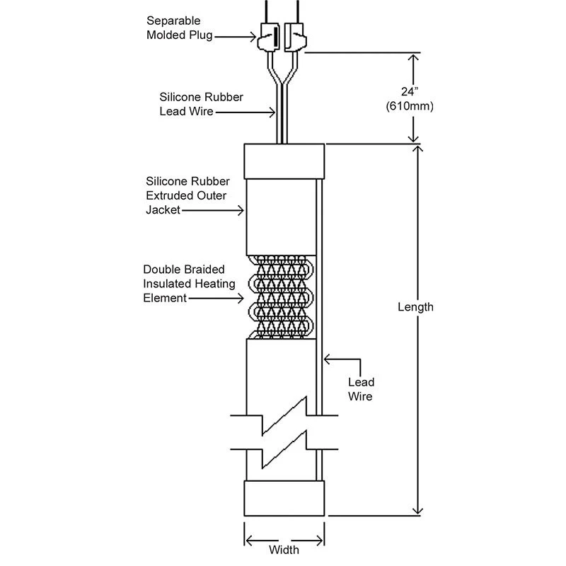 - Durable braided insulated heating element with silicone rubber extruded outer jacket